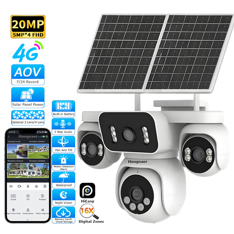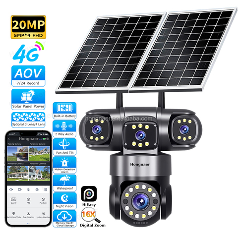 Hongnaer 20MP 10K 4レンズワイヤレスソーラーパワーカメラHiEasy 7/24録音AOV屋外セキュリティCCTV 4G Simカードソーラーカメラ
