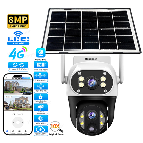 ホンナール 8MP 10倍デジタルズーム ソーラー式防犯CCTV PTZカメラ V380 Pro 4Kデュアルレンズ WiFi屋外 4G SIMカード対応ソーラーカメラ