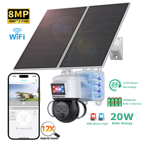 Hongnaer 8MP 12XズームワイヤレスデュアルレンズPTZカメラ24/7レコーディングUbox 4K屋外WiFi CCTVソーラー防犯カメラ