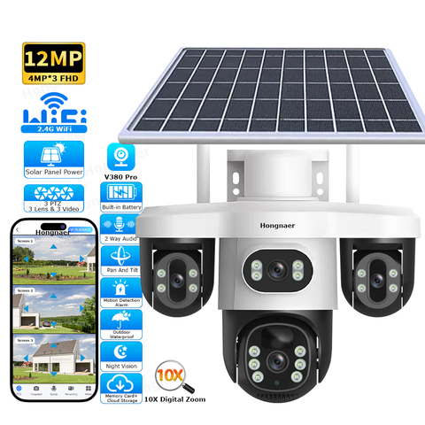 Hognaer 12MP防水WiFi 3レンズソーラーワイヤレス監視CCTV PTZ IPカメラV380プロWiFi屋外ソーラー防犯カメラ